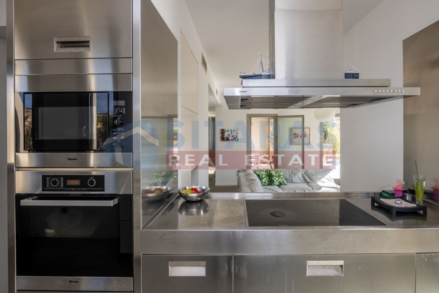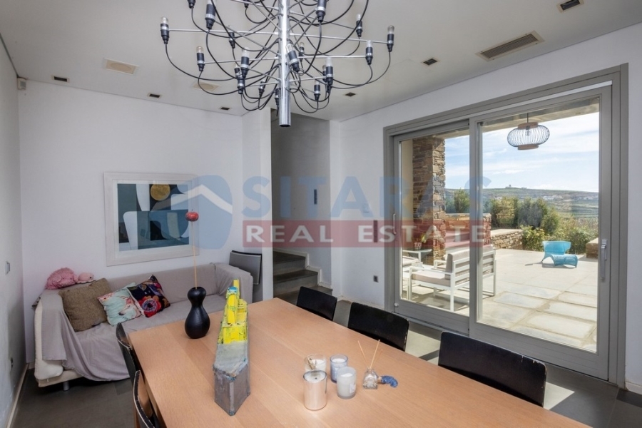 Tinos, on a lush green plot of land of 4,000 square meters, just 2 km from the port, a detached residence of 168 square meters with a basement. It was designed in 2007, with a separate study by a notable architectural firm. It was built (2009) to serve modern needs and at the same time be integrated into the natural environment of the island. The ground floor was chosen exclusively with stone cladding and the planting of several trees, which coexist with the building. Modern, wooden, energy-efficient German-style windows and doors were placed, with large openings, and underfloor heating was installed. During warmer months, the floor is cooled and at the same time a central network with integrated fan coils operates on the roof. It consists of a living room, with a separate kitchen, three bathrooms and three bedrooms, one of which with its own bathroom. In the basement, two large spaces of 75 square meters have been created to be used as a garage-storage room and a fully equipped boiler room. The house has a central alarm system, with magnetic contacts on all openings, a gasoline generator in case of power outage and a pressure tank for uninterrupted water supply. Also, an independent sewage tank, connected to the municipal network and a permit for drilling. Outside, several spaces have been created, covered or not, so that the enjoyment of the unobstructed view and the natural environment is not affected by weather conditions. A well-kept garden with several, productive olive trees, other fruit trees and ornamentals offers the beneficial embrace of nature. The view is impressive towards at least four islands of the Cyclades and the clear blue waters of the Aegean. A remarkable, well-designed detached residence, in a countryside setting, in need of maintenance and repairs, with wonderful views, at a short distance from the town and several sandy beaches.For more information or to schedule an appointment with an office associate, you can call us at (+30)2283025668. Property suggestions are made every day of the week, except Sunday, and upon contact. For the property visit, it is necessary to present the identity and TIN of the interested buyer/tenant, pursuant to Law 4072/11.4.2012.